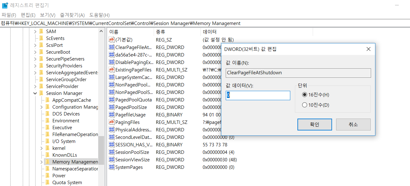 - 레지스트리 설정을 통해 시스템 종료 시 pagefile을 삭제 가능